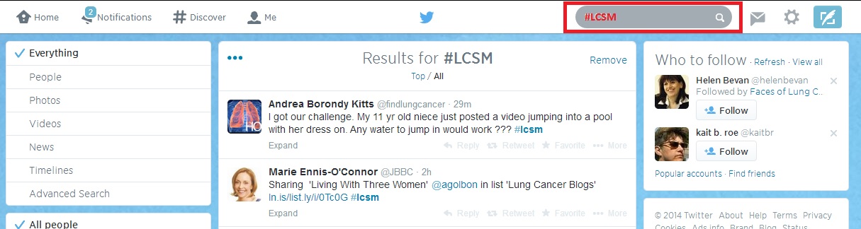 2. To see the tweets in the tweetchat, filter your Twitter feed to show only tweets containing the designated hashtag (in this case, “#LCSM”). To filter your Twitter feed, enter “#LCSM” in the gray box containing the magnifying glass at the top of your Twitter feed. The box is outlined in red for emphasis in the example below. Be sure to click on “All” below the words “Results for #LCSM” — if you don’t click on All, your feed will only show you some (not all) of the tweets containing #LCSM.