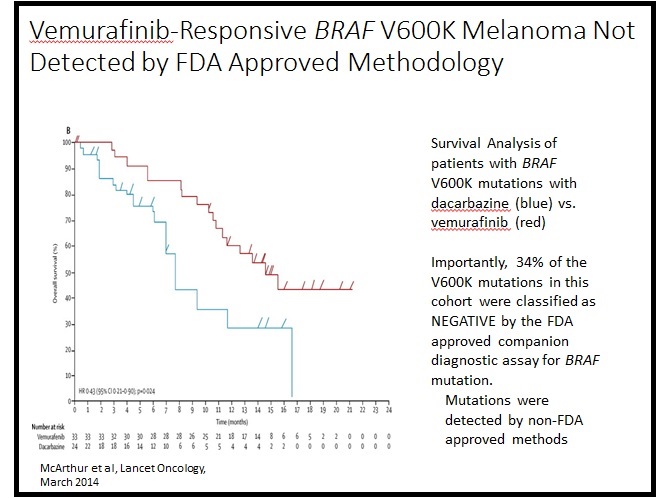 “This Kaplan-Meier Curve demonstrates survival benefit for patients with metastatic melanoma treated with vemurafinib [vs dacarbazine] when they have an ‘atypical’ mutation – V600K. Of note, 34% of the V600K mutation positive patients in this cohort were classified as NEGATIVE by an FDA approved assay and were only detected using a non-FDA approved assay. … This is an example of the clinical validity that evolves rapidly with time. Determining clinical validity is the physician’s job.”