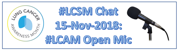 On Thursday November 15, 2018, at 8 PM Eastern Time (5 PM Pacific Daylight Time), #LCSM Chat will hold an Open Mic Nite. We’ll be discussing Lung Cancer Awareness Month (#LCAM) and whatever additional lung cancer topics are foremost on our minds. Our moderator will be Janet Freeman-Daily (@JFreemanDaily). This would be a particularly good chat for those who are just starting with Twitter or tweet chats (please check out our tweetchat primer). Hope you’ll join us!