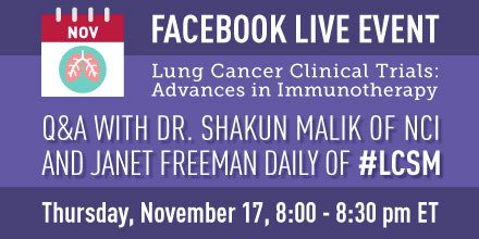 During the first half of our November 17 tweetchat, which starts at the usual 8 PM Eastern time (5 PM Pacific), the NCI’s Dr. Shakun Malik (head of thoracic oncology therapeutics) and Janet Freeman-Daily (lung cancer patient/activist and founding member of #LCSM Chat) will have a 30-minute Facebook Live question and answer session on the topic of “Immunotherapy for Lung Cancer: New Research and Clinical Trials.” The Facebook Live event will be visible on the National Cancer Institute’s Facebook page.