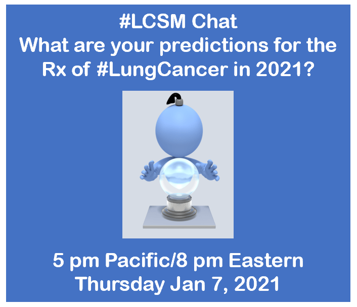 As we bring in the New Year, our 8th #LCSM year, the #LCSM Chat on January 7, 2021, at 8 pm Eastern (5 pm Pacific) will be the Nostradamus chat (or Carnac the Magnificent for our colleagues of a certain age). We ask what are your bold predictions for innovations, policy changes, advocacy strategies and anything else in the prevention, detection, treatment of lung cancer and support of the associated community?